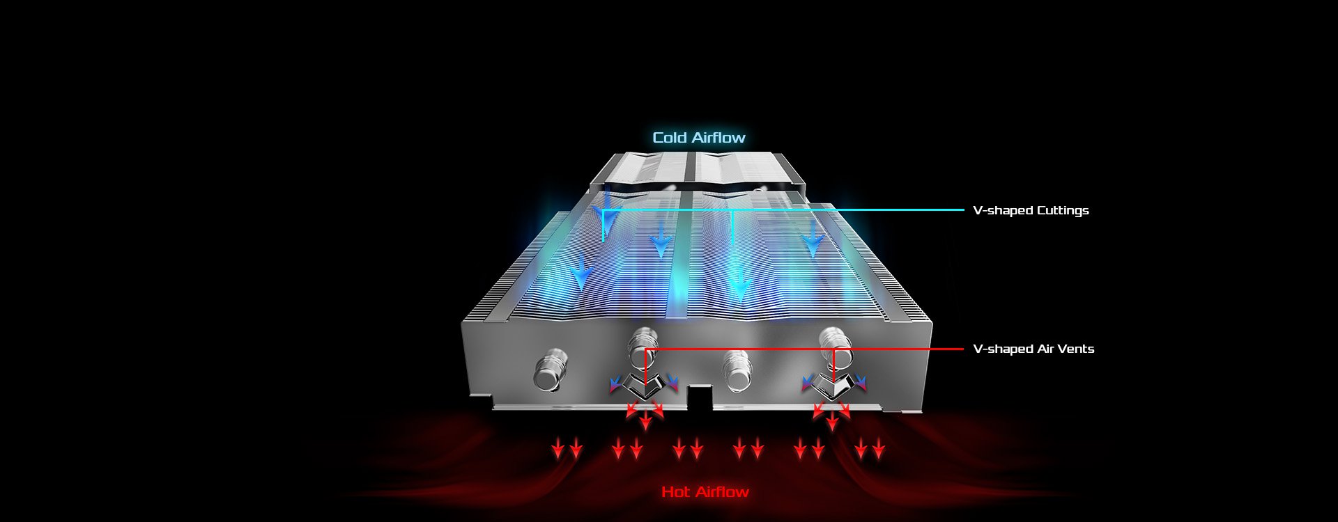 Guide the airflow to go more regularly and quickly to enhance the cooling efficiency by the V-shaped cutting fins and the V-shaped air vents.