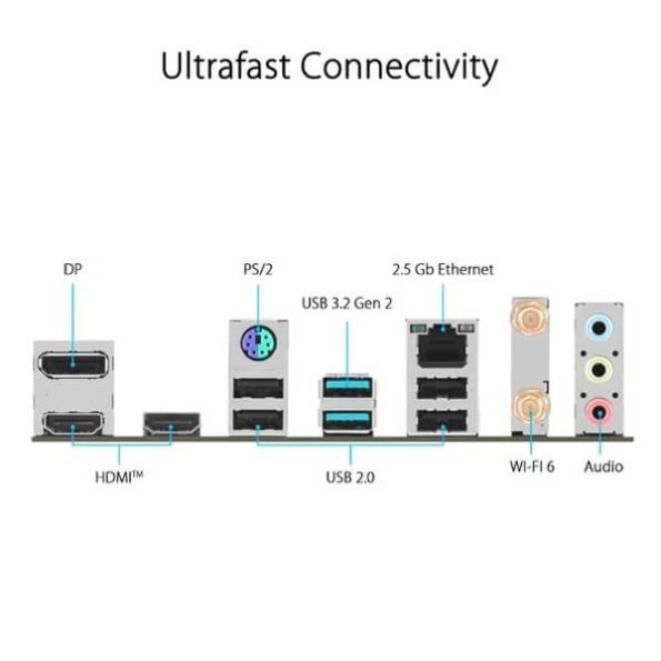 Back Panel I/O Ports | 2 x USB 3.2 Gen 2 ports (2 x Type-A ) 4 x USB 2.0 ports (4 x Type-A) 1 x DisplayPort 2 x HDMITM ports 1 x Wi-Fi Module 1 x Realtek 2.5Gb Ethernet port 3 x Audio jacks 1 x PS/2 Keyboard/Mouse combo port |