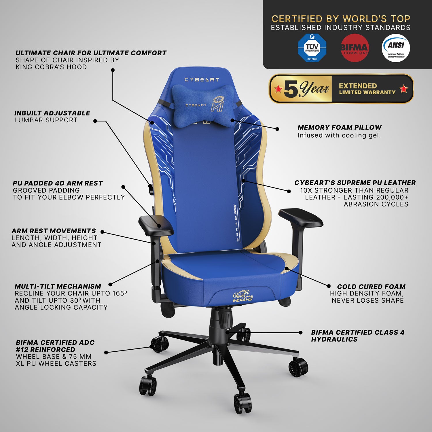 - Official Licensed Mumbai Indians 2077 Gaming / Office Chair. Patented High-Back Backrest shaped with inspiration from King Cobra’s Hood.