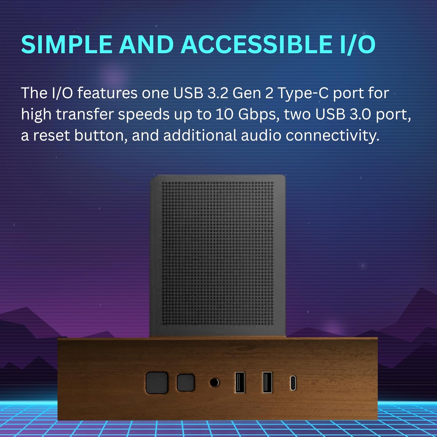 The I/O features one USB 3.2 Gen 2 Type-C port for high transfer speeds up to 10 Gbps, two USB 3.0 port, a reset button, and additional audio connectivity.