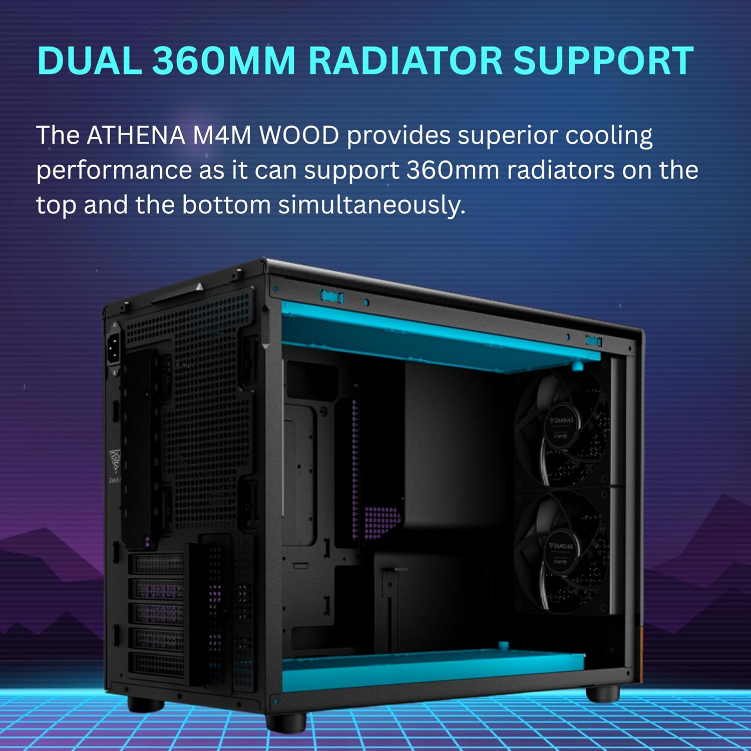 The ATHENA M4M WOOD provides superior cooling performance as it can support 360mm radiators on the top and the bottom simultaneously.