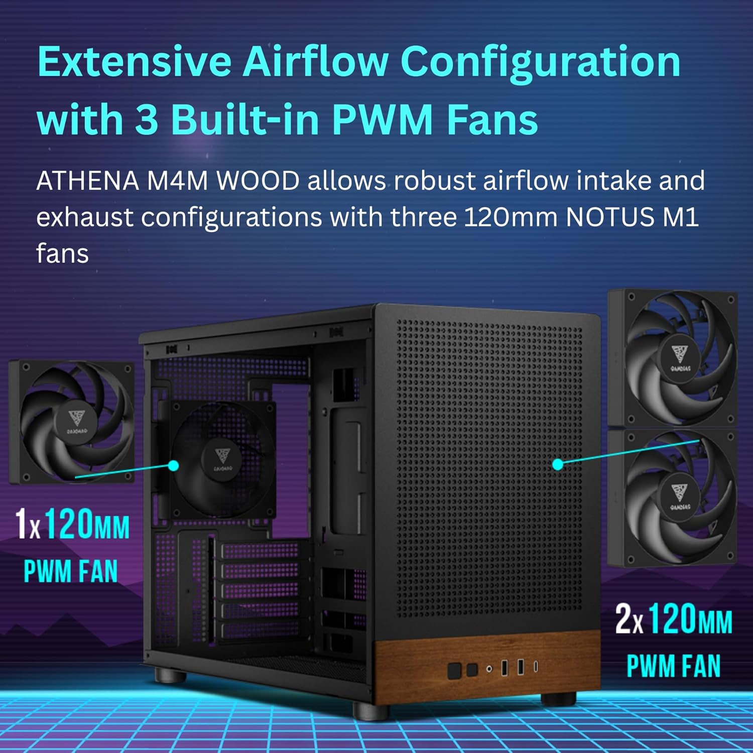 The ATHENA M4M WOOD is a compact micro-tower case that combines high performance with natural aesthetics. It features a fully perforated mesh front panel and a distinctive real wood I/O panel that adds a modern touch. The case comes with three 120mm NOTUS M1 fans to ensure optimized airflow while maintaining a clean look. With support for dual 360mm radiators, BTF motherboards, and GPUs up to 395mm, this case offers excellent thermal performance and broad hardware compatibility in a space-efficient design.